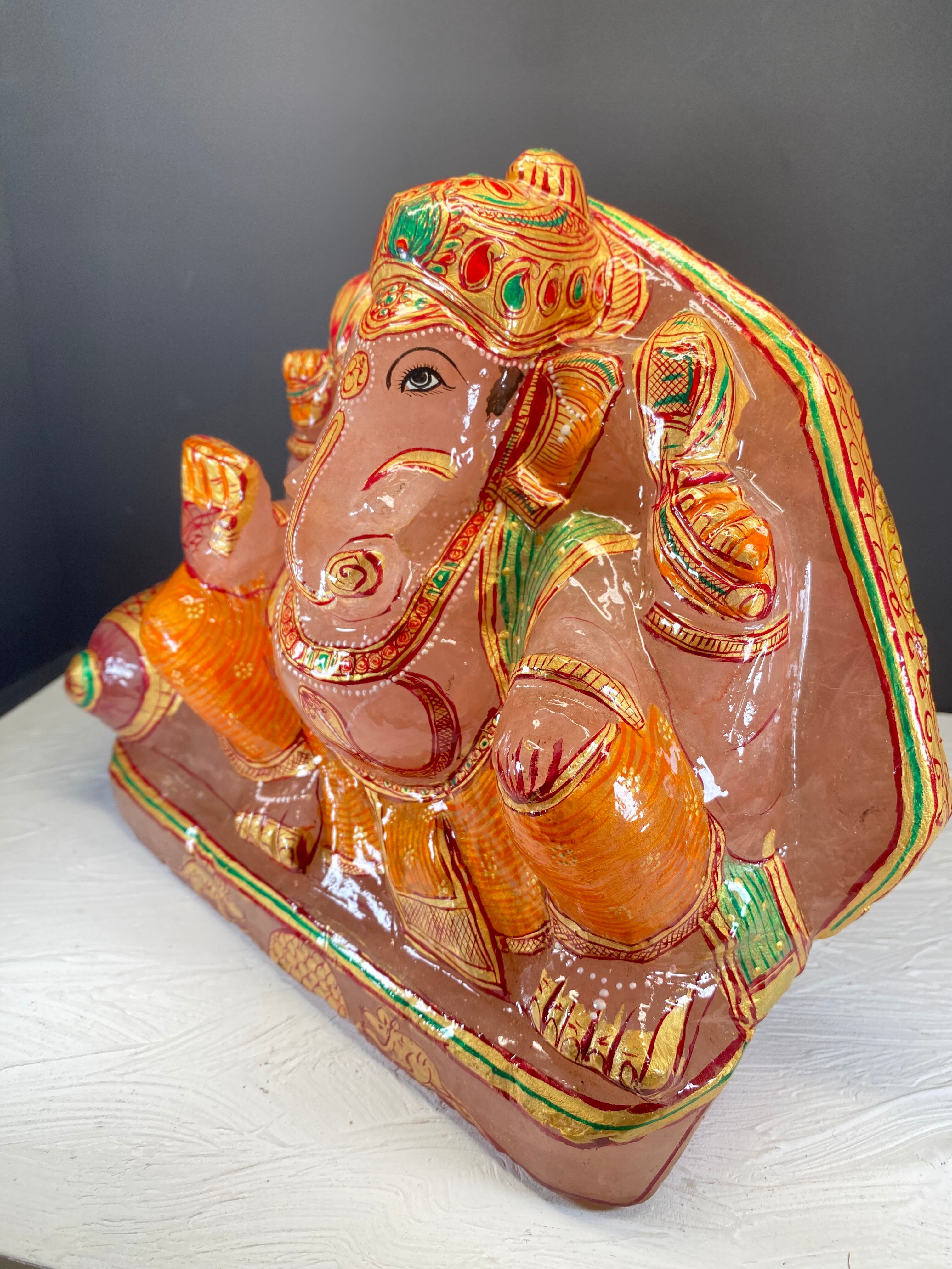 太鼓腹の人間の身体に 片方の牙の折れた象の頭をもった神で、4本の腕をもつ。障害を取り去り、また財産をもたらすと言われ、商業の神・学問の神とされています。