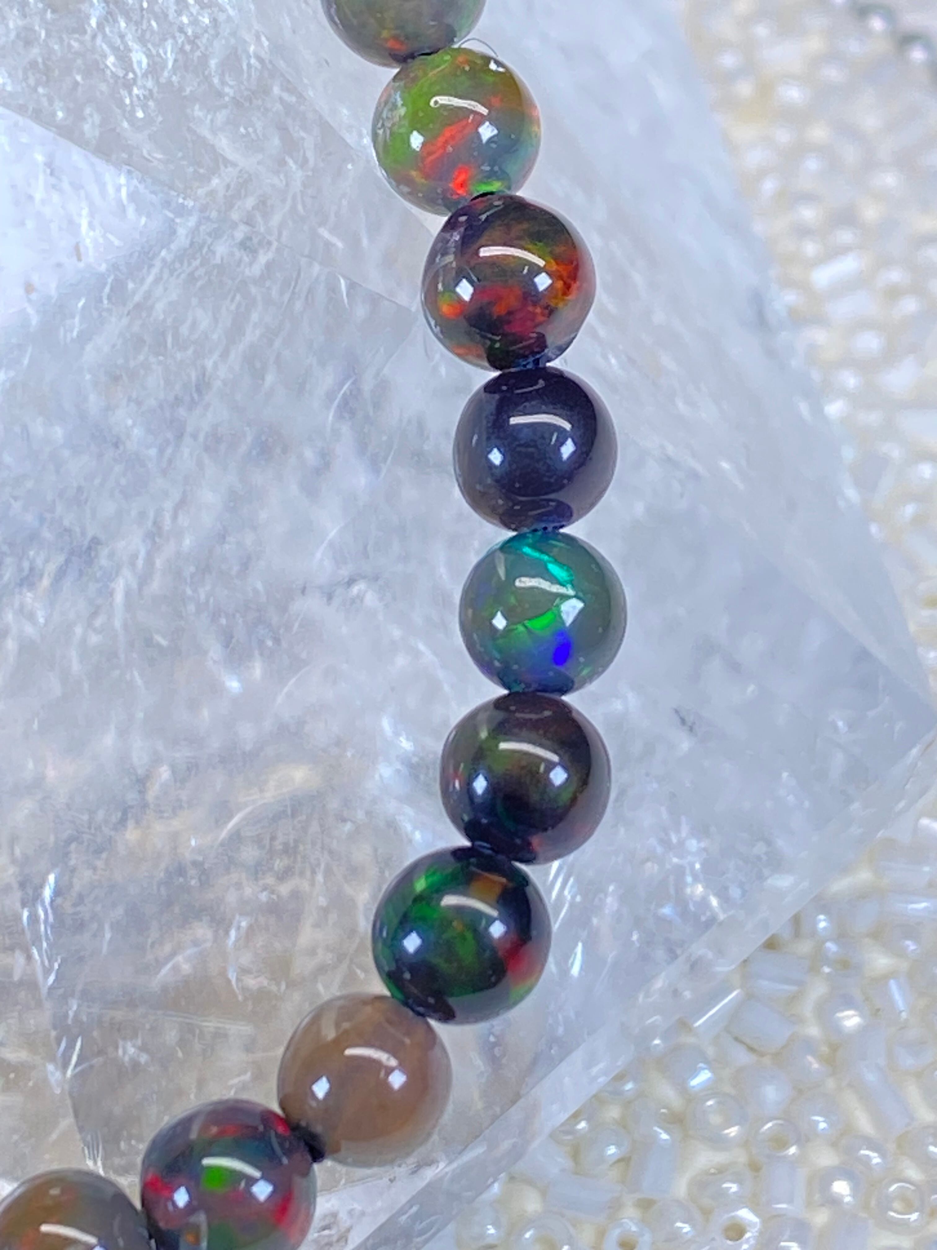 全珠ではありませんが、赤・緑・青などの遊色効果のあるブレスレットです。